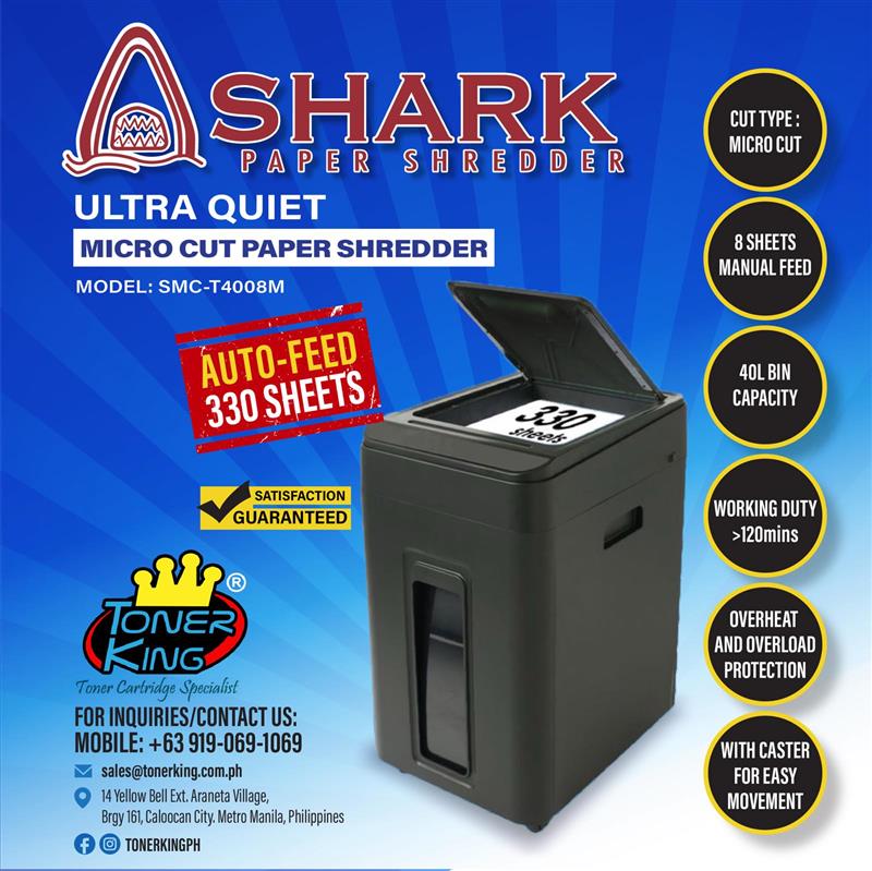 Paper ShredderThe Shark SMC-4018 is a commercial-grade paper shredder designed for efficient and secure document disposal. It features auto start/stop functionality, offers cross-cut and micro-cut shredding options, and can shred various media including paper, staples, credit cards, and CDs. With a shredding speed of 3 meters per minute, it ensures reliable performance for office or business use.