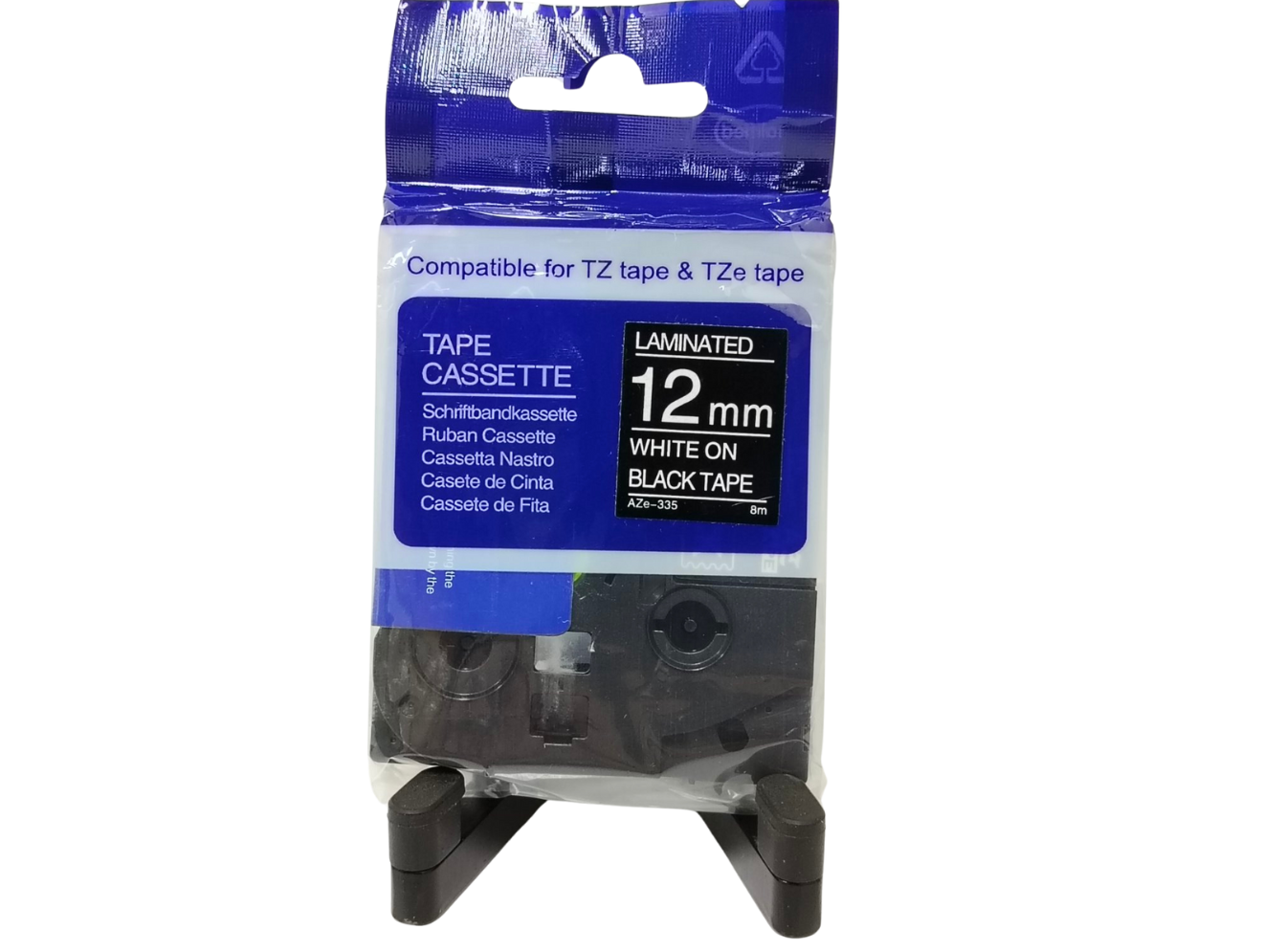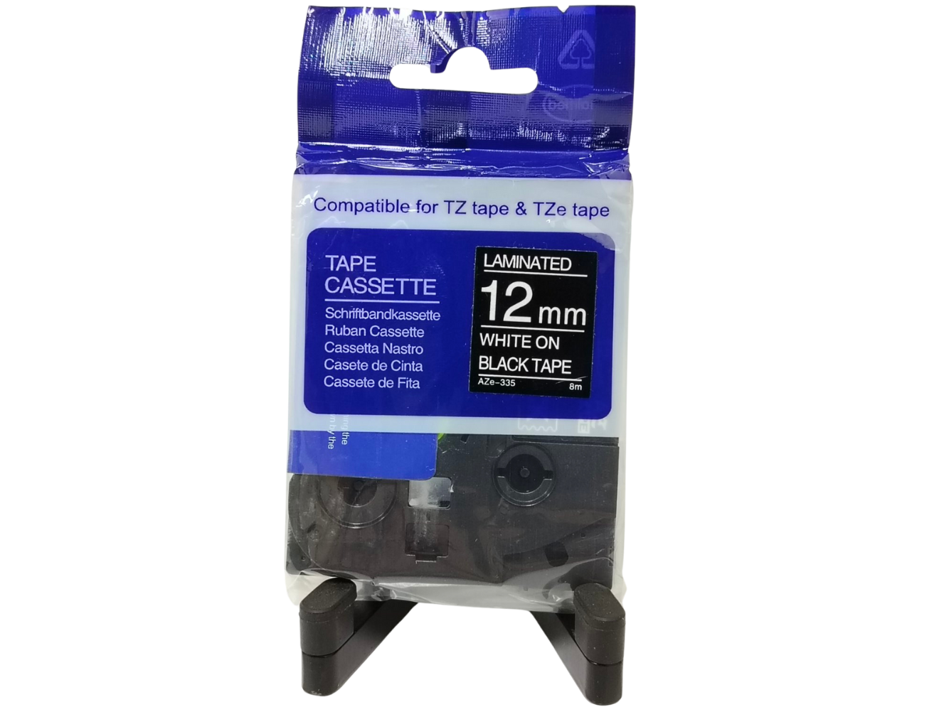 Tape CassetteDurable laminated tape with black text on clear background, compatible with TZ and TZe tape printers. Ideal for labeling with a professional transparent finish.