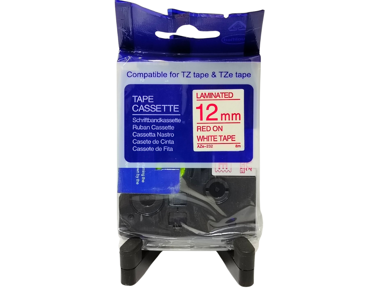 Tape CassetteLaminated tape displaying red text on a white background, great for eye-catching labels that require visibility and color distinction.