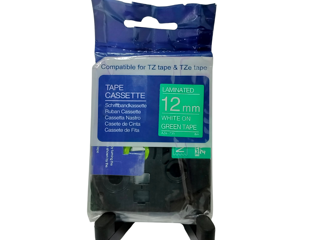 Tape CassetteLaminated tape with white text on a green background, perfect for color-coded labeling and organizing with lasting print quality