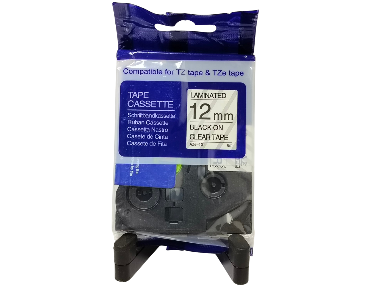 Tape CassetteDurable laminated tape with black text on clear background, compatible with TZ and TZe tape printers. Ideal for labeling with a professional transparent finish.